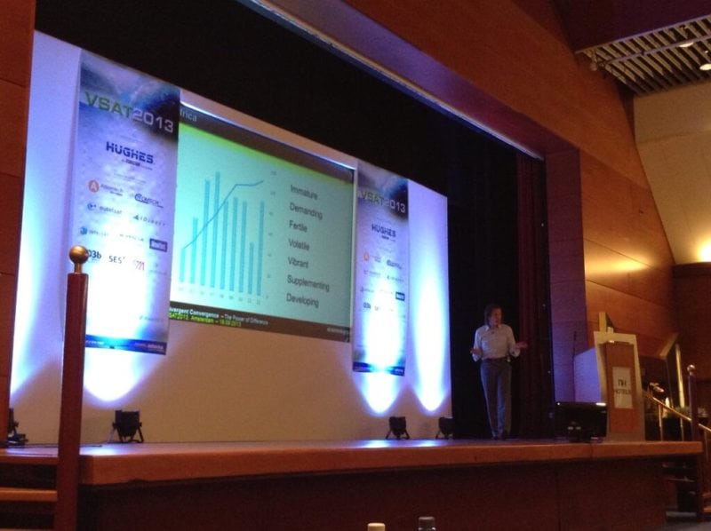 Bull presented a state of the union of the VSAT market in all key regions of the world. In North America, he described the market as “mature, polarized, consolidated, hybridized, marginalized, etc.” and that it remains one of the most innovative markets around. “There are a couple of big operators and a lot of small operators. It is moving to a hybridized solution, so you see Hughes Networks Systems and Spacenet, both offering combined satellite and terrestrial services. But, I do see VSAT being pushed to the edge here, hence using the term ‘marginalized,’” he said.