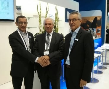Abderrahmane Bessaih, Director Business Development North & West Africa, Newtec; Abdelmalek Houyou, General Director, Telediffusion d’Algerie; Didier Tymen, VP Sales EMEIA, Newtec after the TDA-ASBU MENOS signing session.