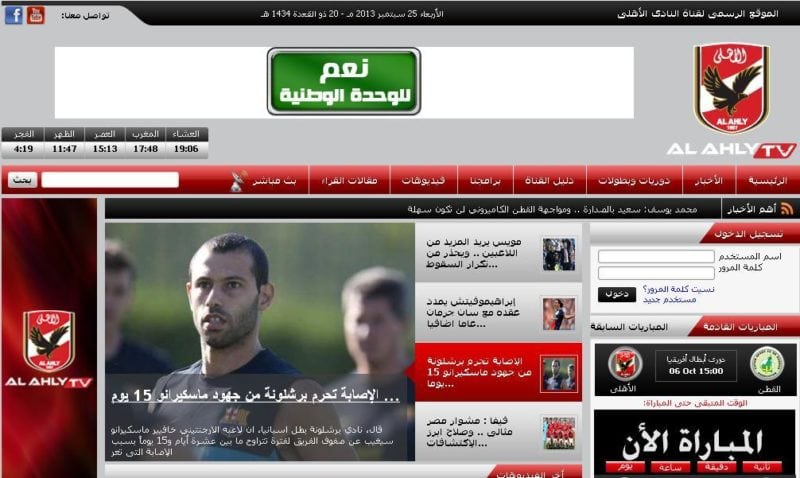The website of Ahly TV, a 24-hour sports channel focusing on premium sports content widely popular in the Egyptian and Arab communities.