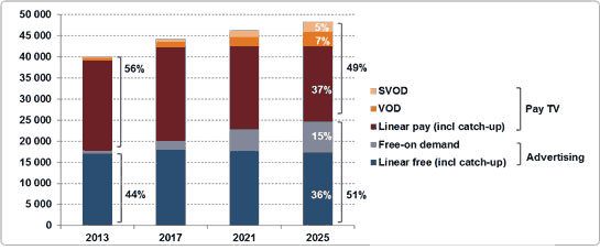In the report, Idate outlines a “business as usual” situation. The scenario is characterized by key points including: live viewing partially overtaken by on-demand viewing, piracy that creates obstacles to the switch from physical to online viewing, increased competition in the pay-TV market, which affects prices, and ad rates for live TV decreasing while increasing for video on-demand (VoD).