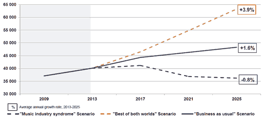 Additionally, Idate outlined two alternative possibilities, which represent how the increased replacement or parallel use of live and on-demand viewing would affect the TV industry’s future: the music industry syndrome and the best of both worlds. In the former scenario, the video services market in Europe’s top five markets will shrink by an average of negative 0.8 percent a year, and not be balanced by on-demand services, including catch-up TV services that are expected to decrease by an average of negative 4 percent annually. The latter possibility puts average annual growth at 3.9 percent, including 2 percent growth for live broadcasting services.