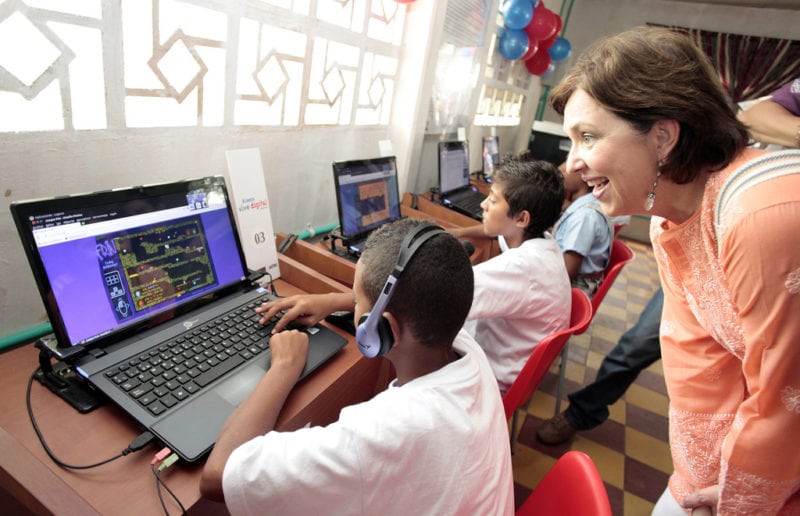 Deputy Minister María Isabel Mejía with children at installed digital kiosks. Photo: Colombia Ministry of Information and Communication Technology