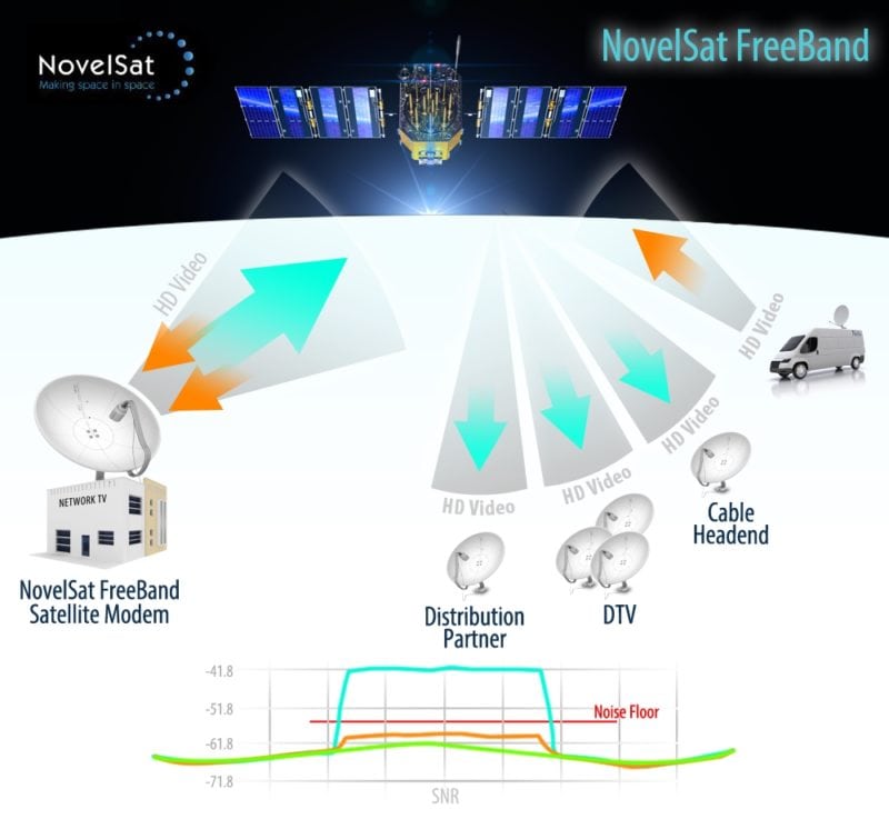 NovelSat Freeband works by reusing existing satellite bandwidth within a customer’s distribution network. Through this bandwidth reuse technique, satellite broadcasters can send video and data in a point-to-multipoint distribution network at a lower cost.