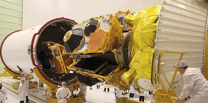 Six of Globalstar’s second-generation satellites being placed into the Soyuz ST payload fairing ahead of their 2013 launch. Photo: Arianespace