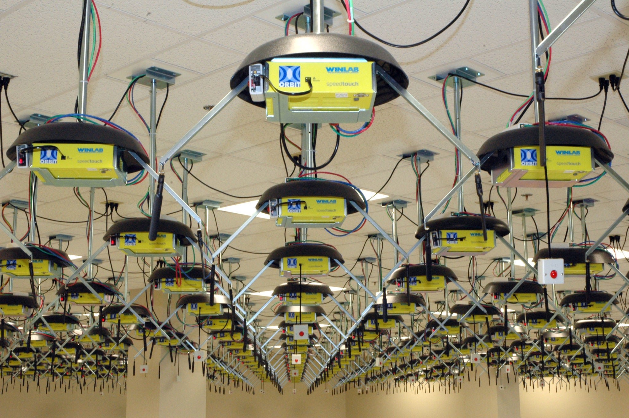 NSF-funded ORBIT wireless network testbed at Rutgers WINLAB, featuring an indoor grid of 400 radio transmitters to simulate a variety of network conditions and proposed mobile services. Photo: Rutgers WINLAB