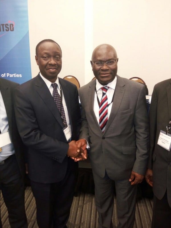 Shola Taylor (right), secretary-general of CTO congratulating Patrick Masambu (left), director-general of ITSO. Photo: CTO