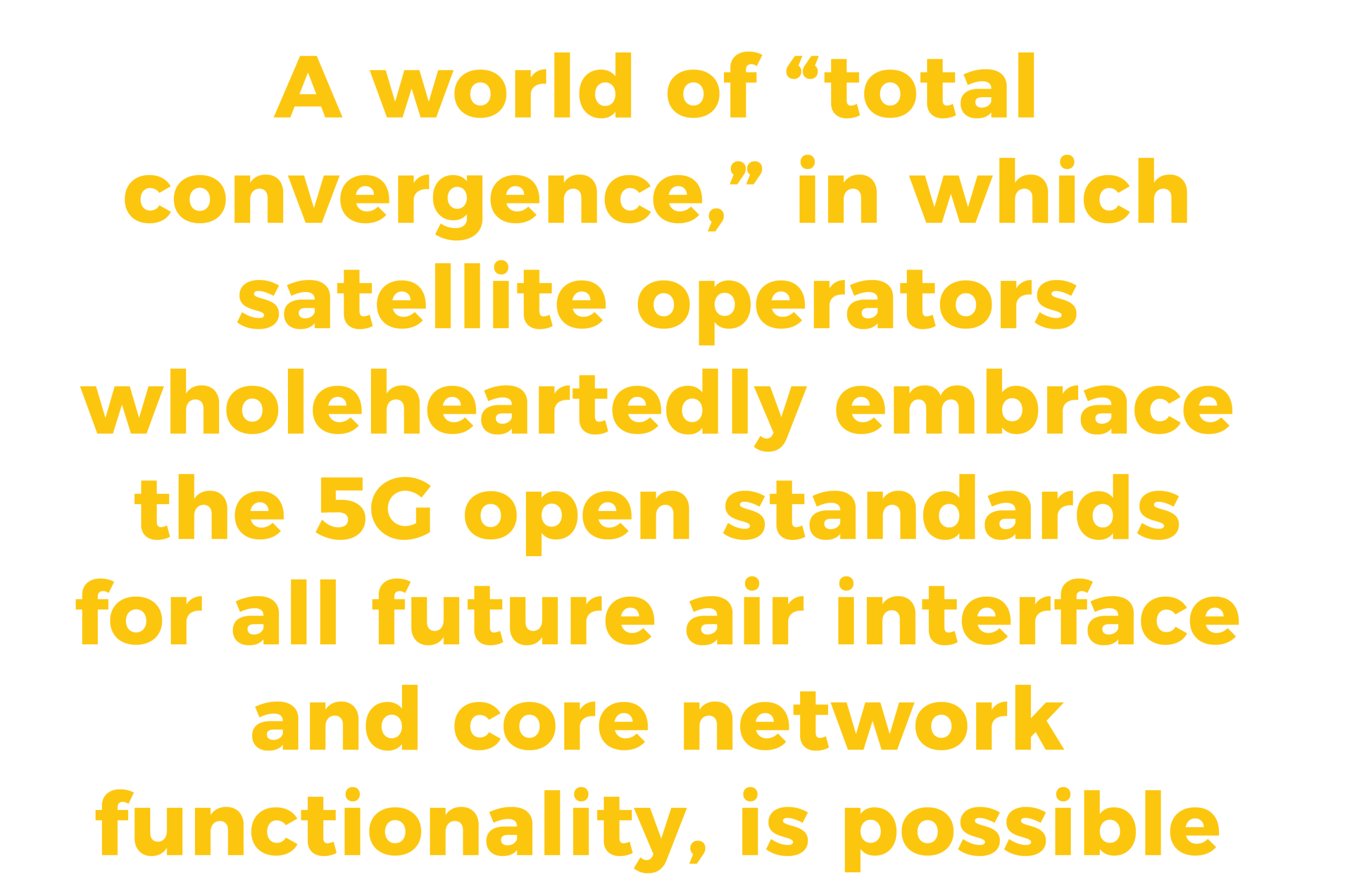 A world of “total convergence,” in which satellite operators wholeheartedly embrace the 5G open standards for all future air interface and core network functionality, is possible. In such a world, we suggest, network operators will extract competitive advantage by doubling-down their investments into a winning combination of spectrum assets, satellite constellations with advantageous physical orbit characteristics and a payload evolution strategy that will deliver best-in-class 5G connectivity and services as the 5G standard develops.