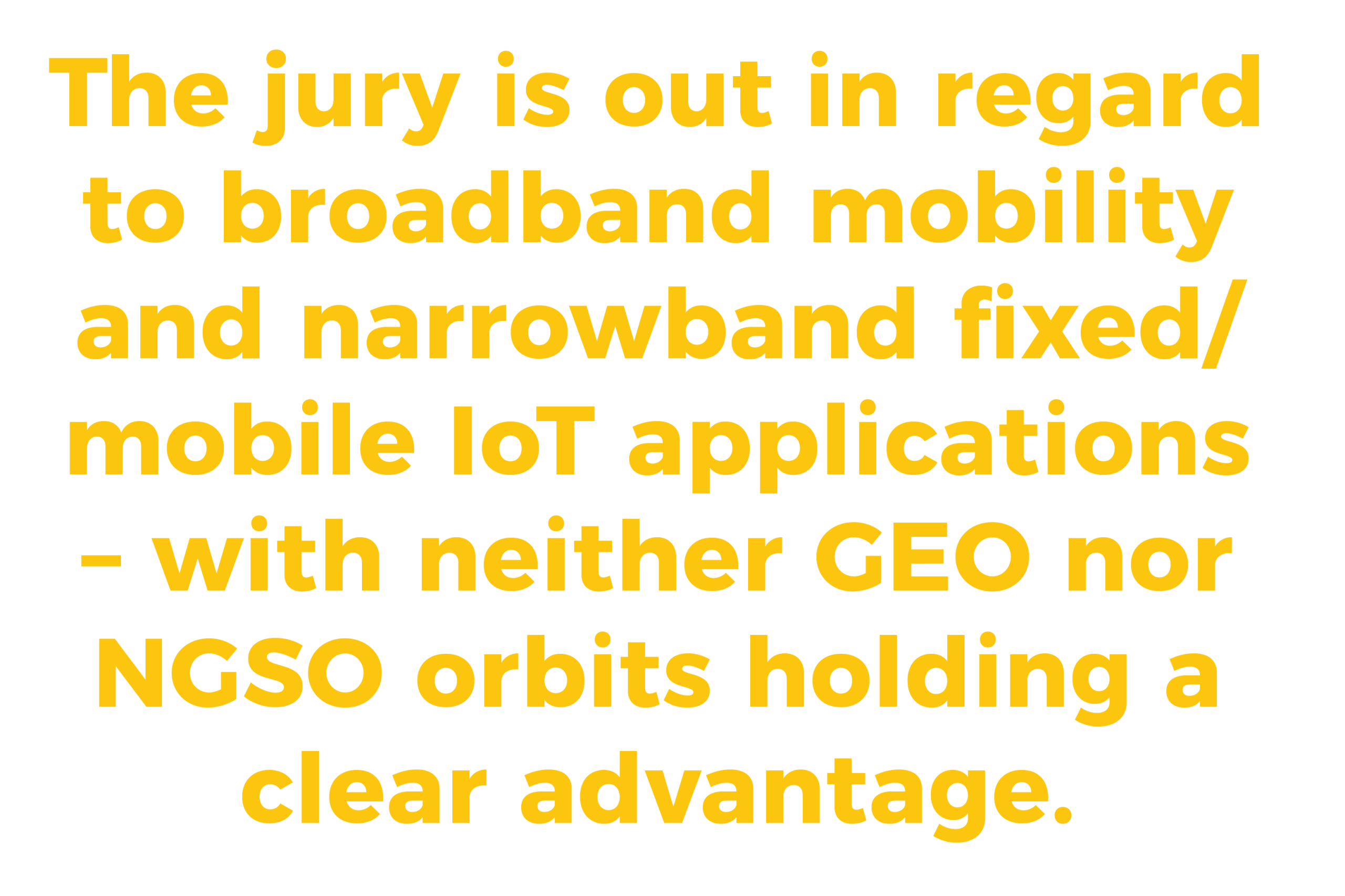 The jury is out in regard to broadband mobility and narrowband fixed/mobile IoT applications – with neither GEO nor NGSO orbits holding a clear advantage. Perhaps this is the arena in which the fiercest battles will be fought.