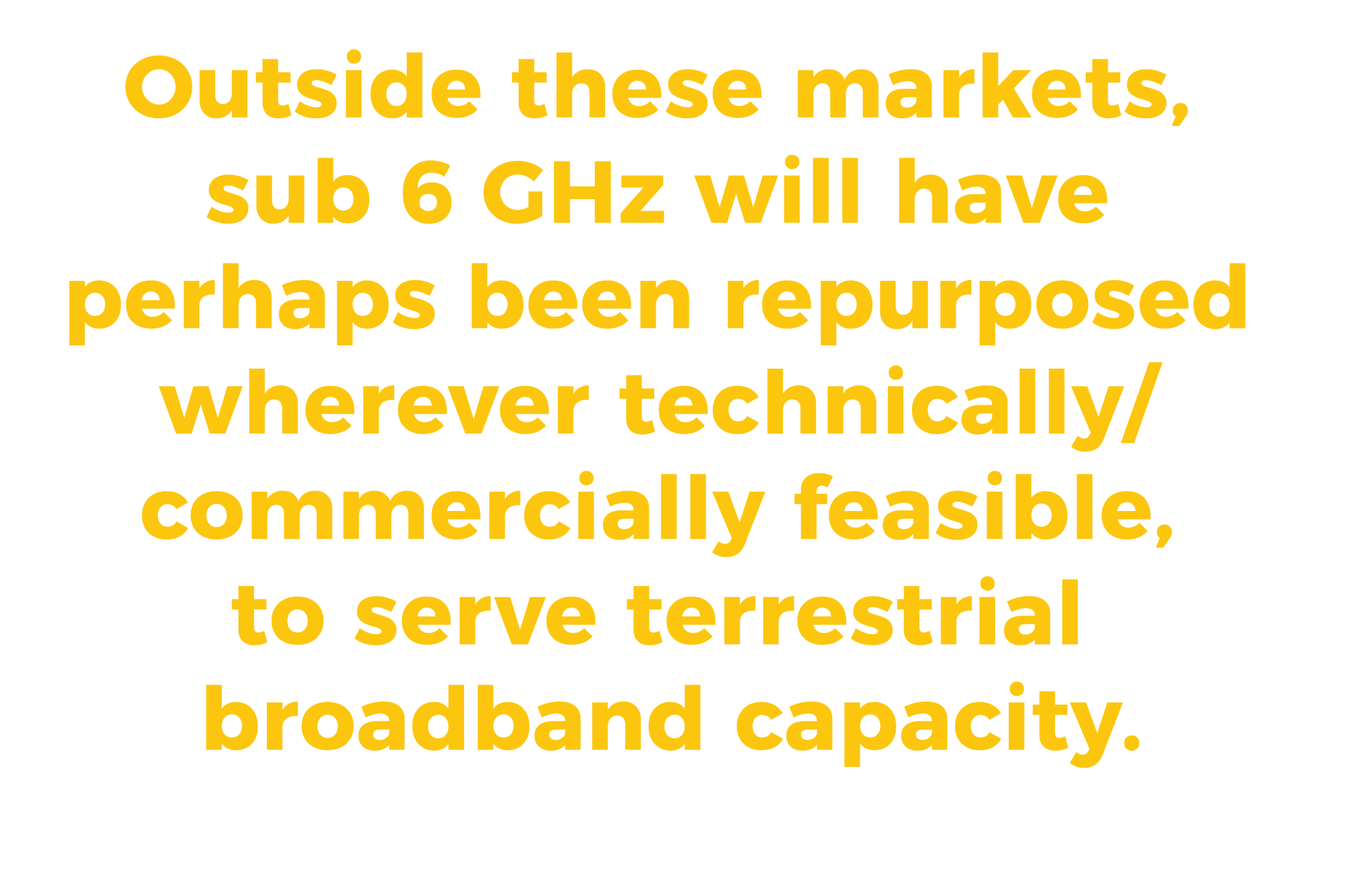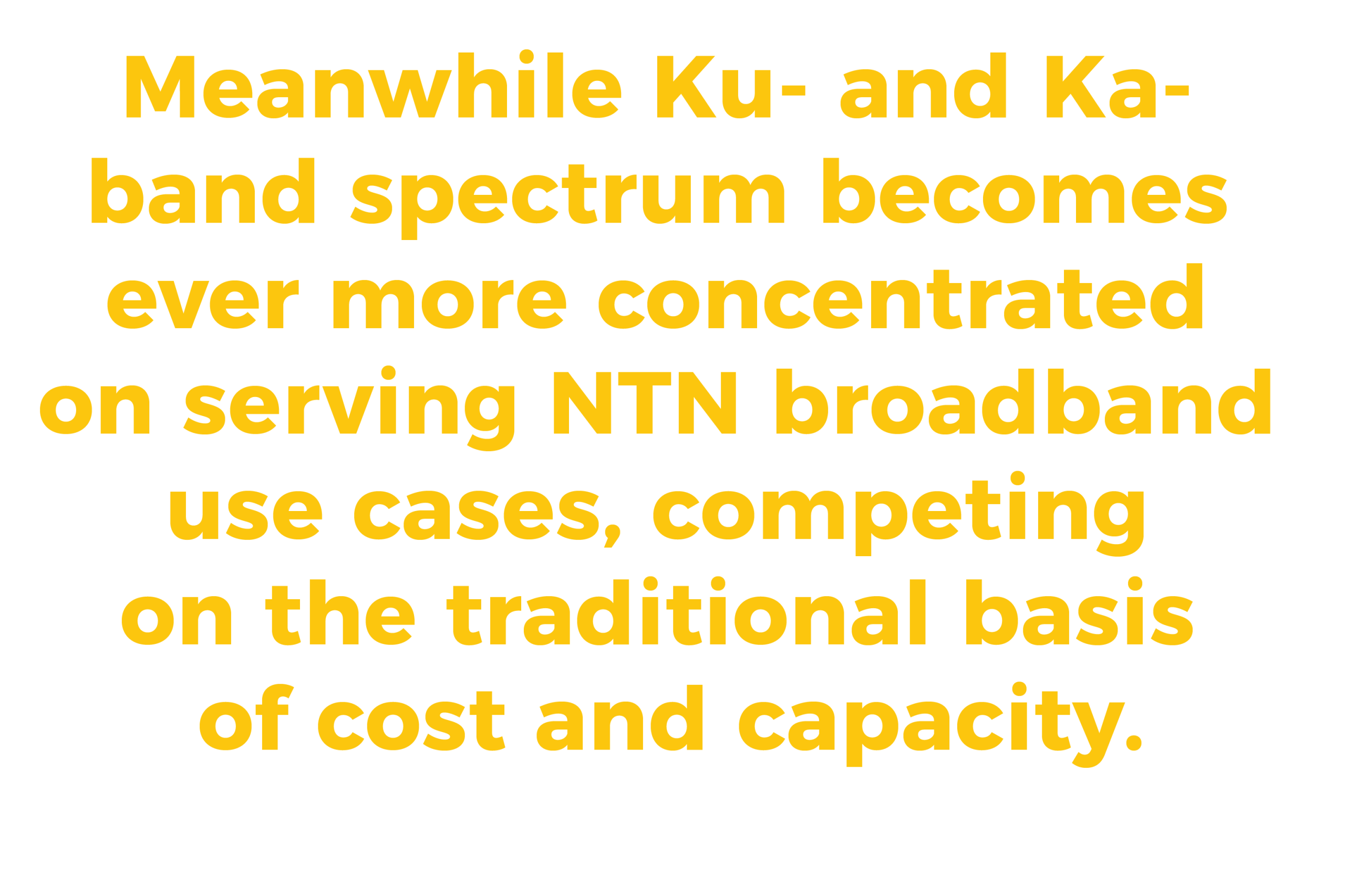 Outside these markets, sub 6 GHz will have perhaps been repurposed wherever technically/commercially feasible, to serve terrestrial broadband capacity. Meanwhile Ku- and Ka-band spectrum becomes ever more concentrated on serving NTN broadband use cases, competing on the traditional basis of cost and capacity.