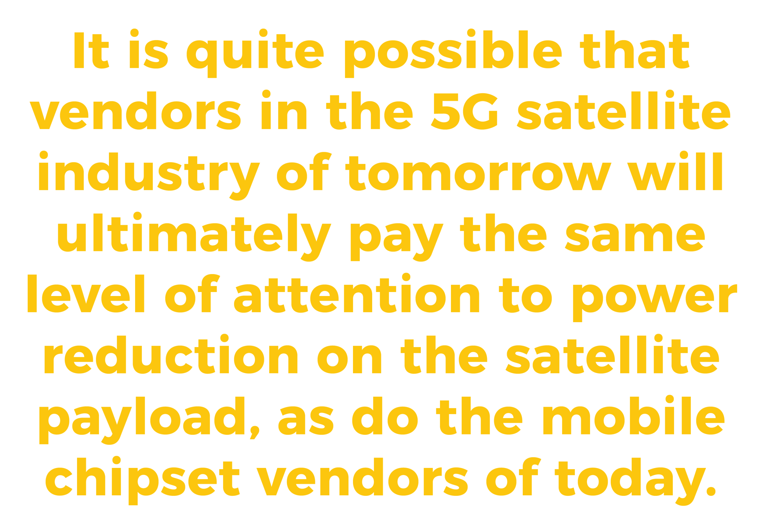 Irrespective of which waveforms need to be supported, 5G satellite technology vendors will need to develop highly power-efficient software defined platforms to gain a competitive edge. It is quite possible that vendors in the 5G satellite industry of tomorrow will ultimately pay the same level of attention to power reduction on the satellite payload, as do the mobile chipset vendors of today. This is especially true of nanosatellites with very limited power budget and we could even see a transfer of skills from the mobile chipset industry into satcom to help make it happen.