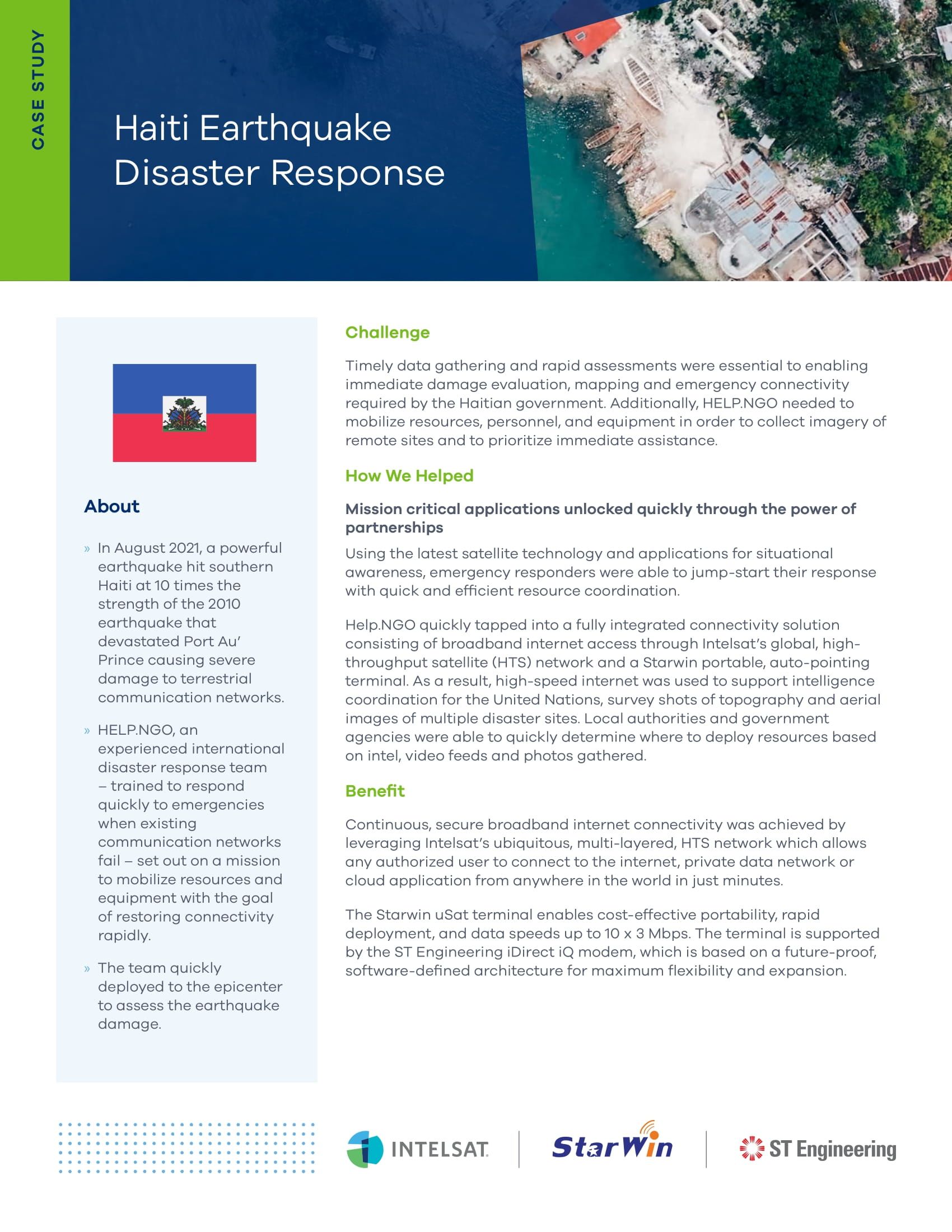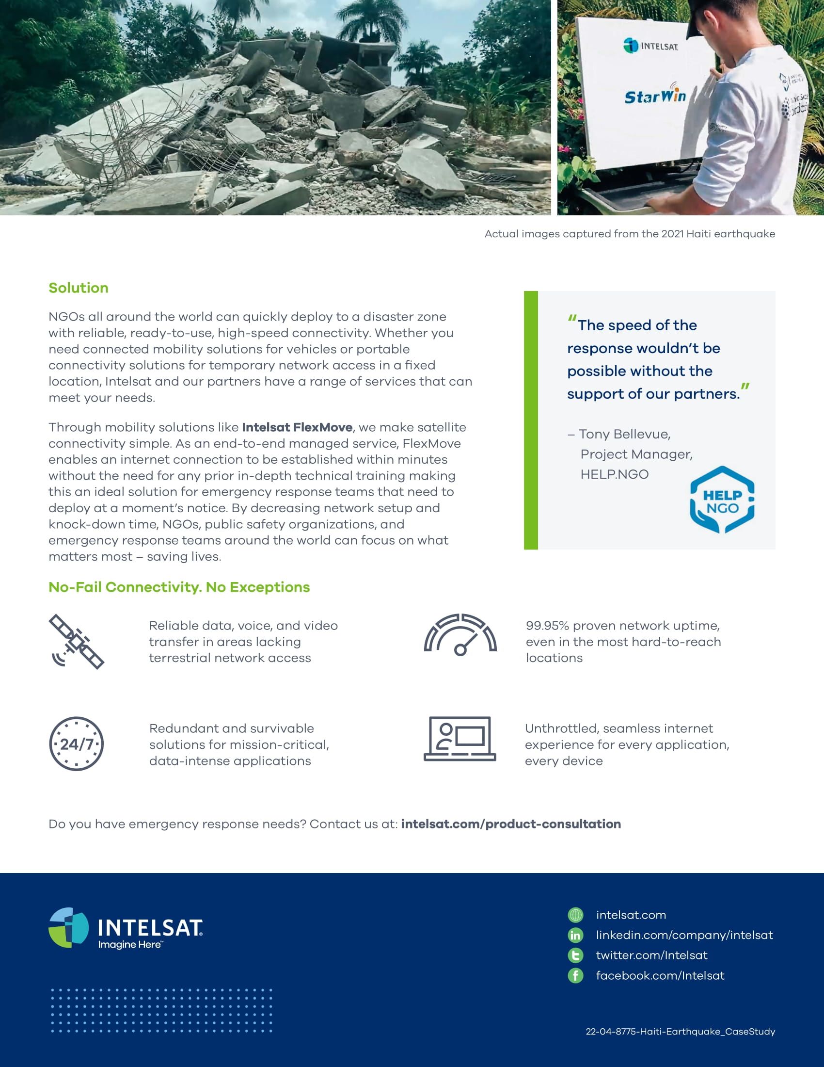 Haiti Earthquake Disaster Response When disaster strikes, every second counts to save lives. Intelsat joined forces with HELP.NGO, an international disaster response team, deployed FlexMove to assess the earthquake damage. Download the PDF TopBuilt with Shorthand