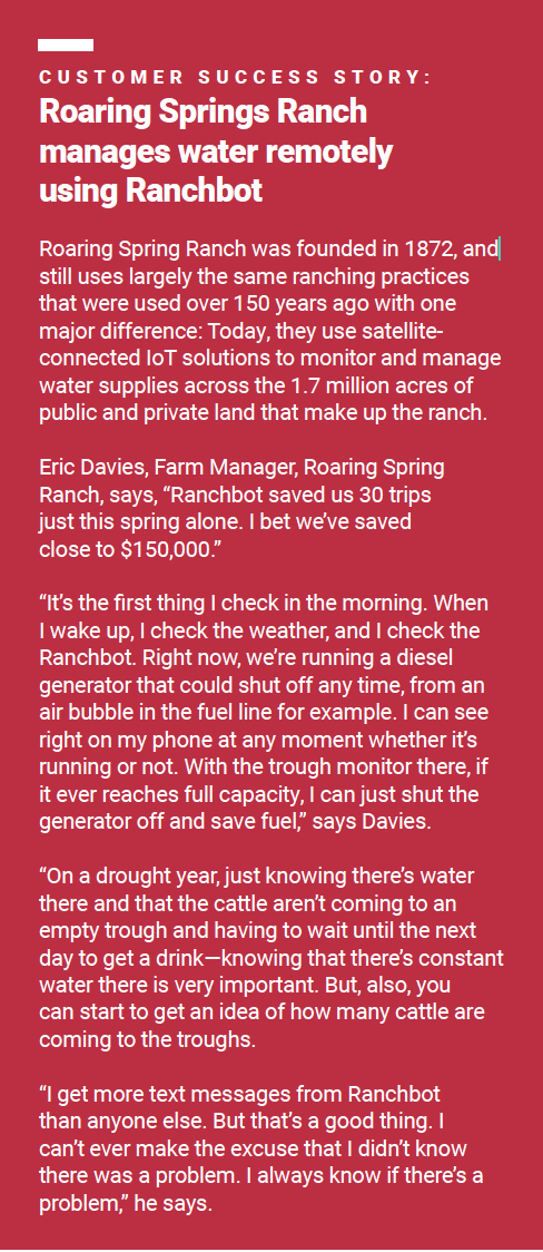 The integration of ORBCOMM satellite IoT modems into Ranchbot products ensures reliable 24/7/365 communications regardless of how remote or dispersed a rancher’s water resources may be.
