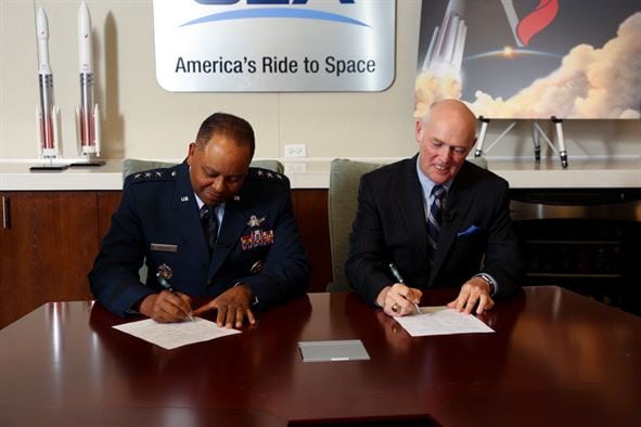 Lt. Gen. Samuel Greaves, Air Force program executive officer for Space and SMC commander, and Tory Bruno, ULA president and CEO, sign a Cooperative Research and Development Agreement or CRADA for the certification of ULA’s Vulcan Launch System at a ceremony, Sept. 27. Photo: ULA