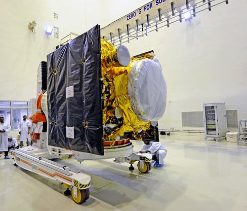 The IRNSS 1A undergoing checks in preparation for launch aboard a PSLV-XL rocket.