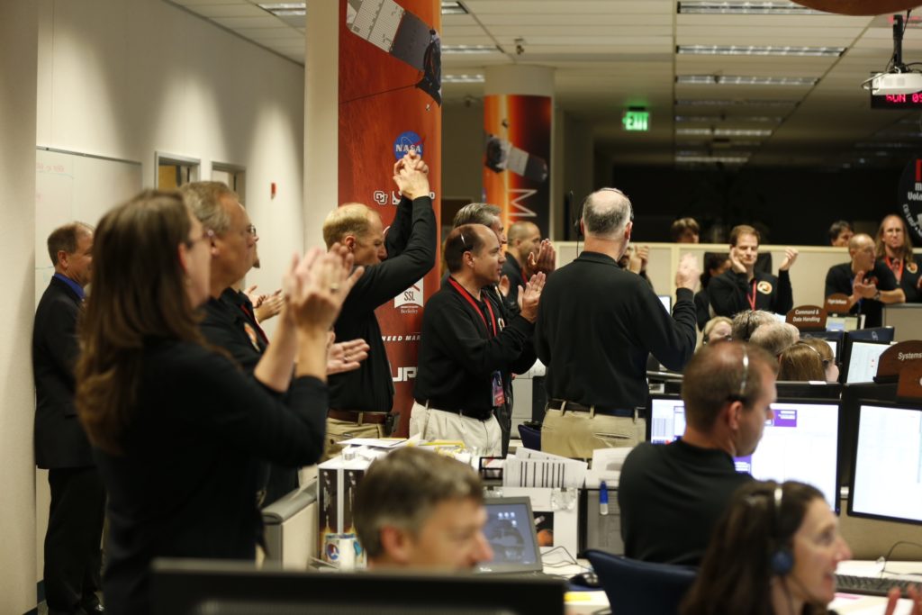 Members of the mission team at the Lockheed Martin Mission Support Area in Littleton, Colo., celebrate after successfully inserting NASA’s MAVEN spacecraft into orbit. Photo: NASA/Lockheed Martin