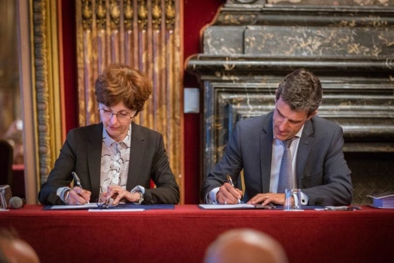 Magali Vassiere, ESA’s director of Telecommunications and Integrated Applications, and Bertrand Maureau, vice-president telecommunications business line at Thales Alenia Space, signing the Neosat C/D phase contract. Photo: ESA