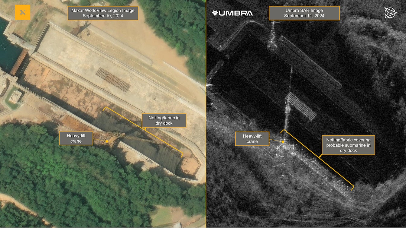 An Umbra SAR image on the right, and WorldView Legion satellite on the left. Maxar graphic