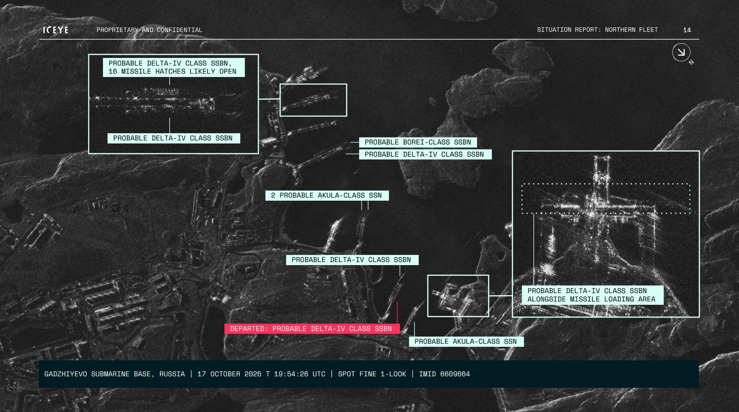 An internal situation report provided to Via Satellite by Iceye demonstrates its imaging capability. The report includes three satellite images of Severomorsk Naval Base in Murmansk, Russia, on one end of the Northern Sea Route. The images provide an overview of the base across nine days in October 2025 and flag the departure of a probable Admiral Gorshkov-class frigate and probable Udalov-class destroyer.