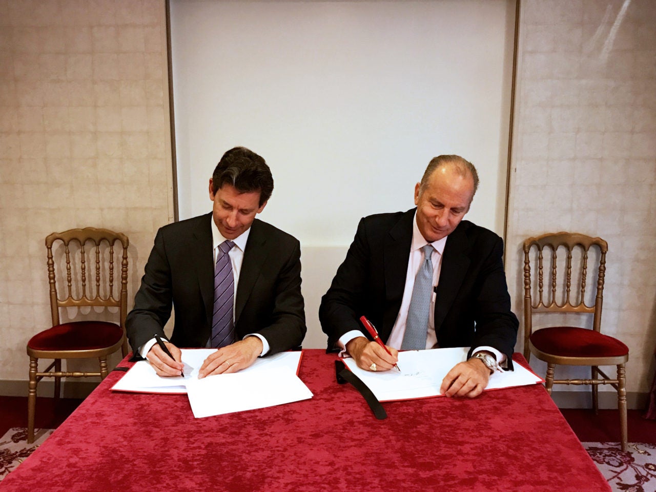 Dan Hart, president and CEO of Virgin Orbit, and Cliff Beek, president of Cloud Constellation sign an agreement during World Satellite Business Week. Photo: Cloud Constellation.