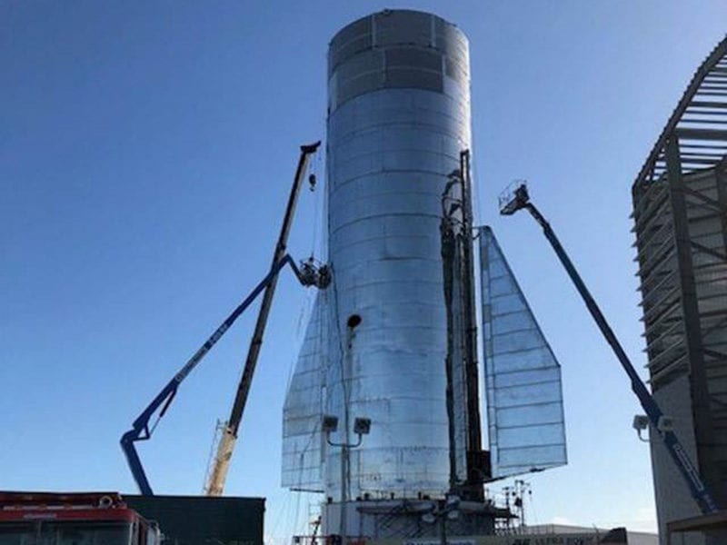 Members of SpaceX’s team in Texas use cranes to add rear moving fins to the Starship Mk1 prototype. Photo: Elon Musk via Twitter/GeekWire
