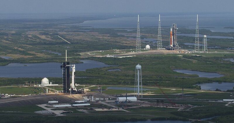 SpaceX’s Axiom-1 mission on Launch Pad 39A with NASA’s Artemis I in the background on Launch Pad 39B in April 2022. Photo: NASA