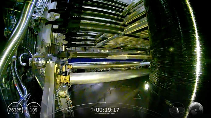 The Starship upper stage reached a suborbital trajectory and began successfully deploying eight mock-up Starlink satellites around 19 minutes into the mission through a payload bay.