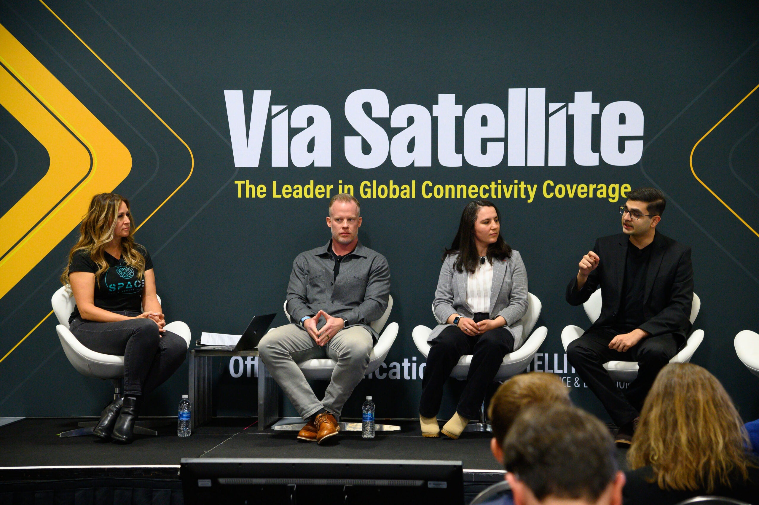 Luke Fischer, SkyFi CEO, second from left. Mariana Curdoglo of Planet Labs, third from left, and Pixxel CEO Awais Ahmed, right. Photo: Access Intelligence