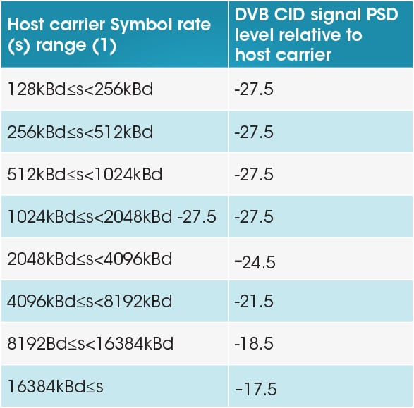 The subcarrier CID signal is transmitted as a BPSK carrier at one of two symbol rates, 224Ksymbols or 112KSymbols at +220Hz (no spectrum inversion) or -220Hz (spectrum inversion) from the host carrier center frequency at -27.5dB referenced to the host carrier spectral density. This level increases as the host carrier bandwidth increases as described in Table 1 below.