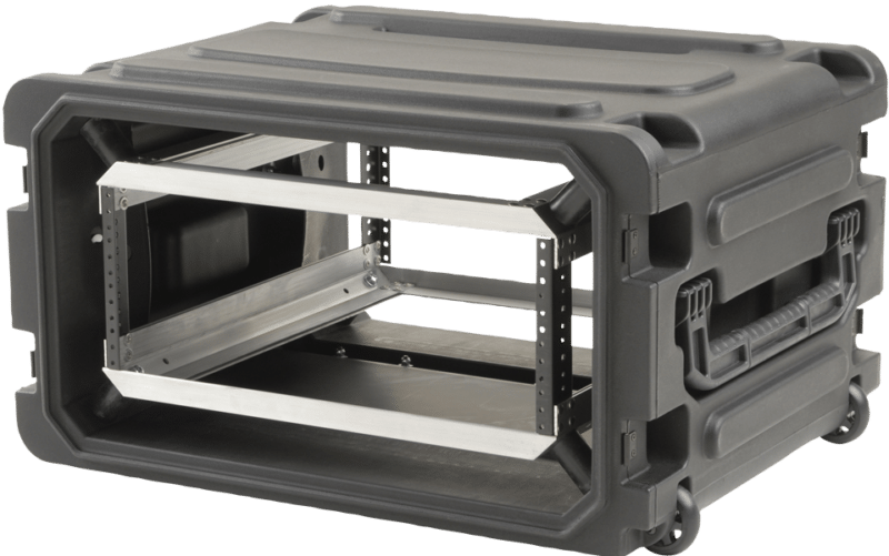 A proper shock-mounted equipment rack case will have an internal frame that is mounted on adjustable shock absorbers on all eight corners of the rack itself, controlling the effects of shock on all three axes.