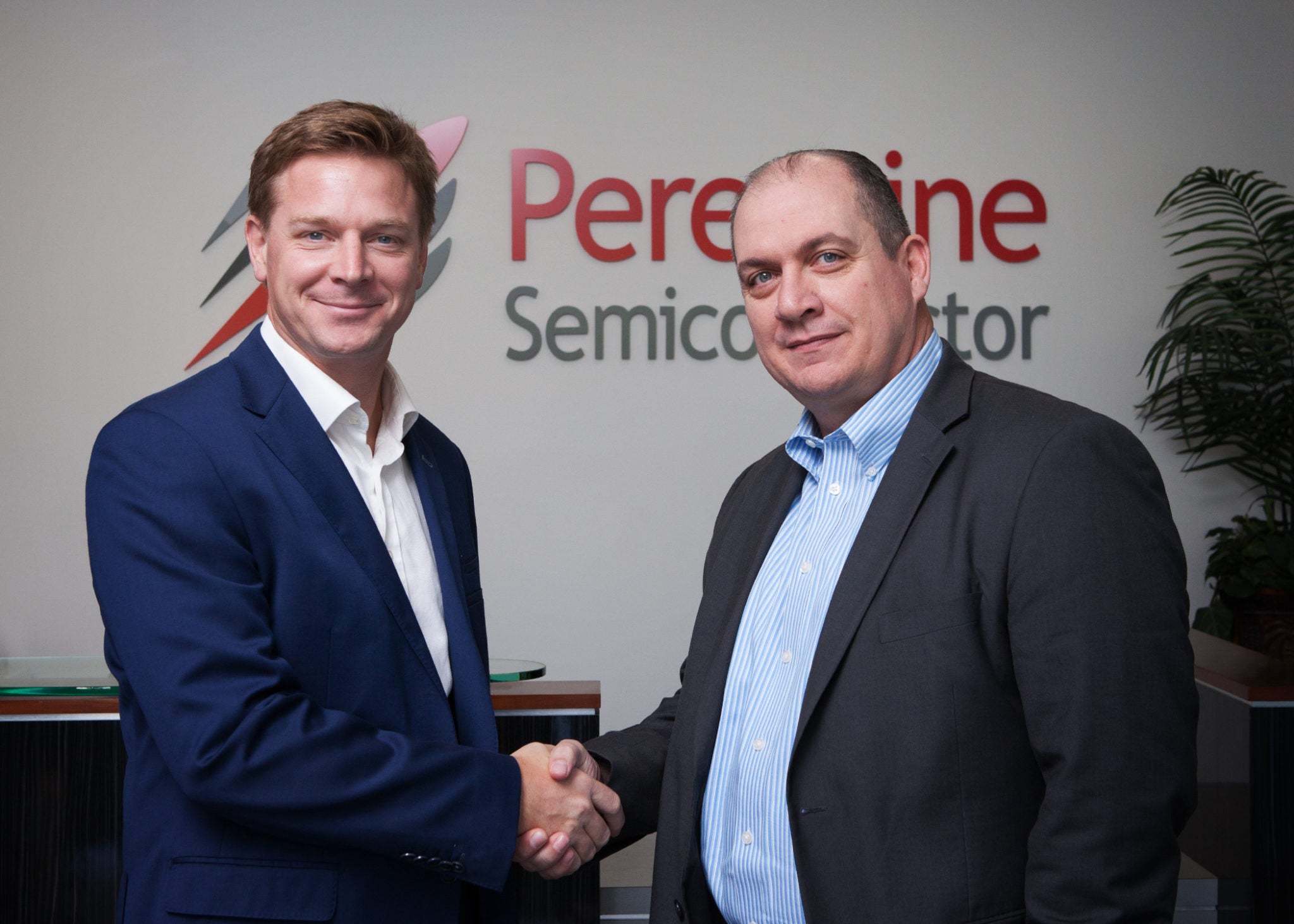 Duncan Pilgrim (left), vice president and general manger of Peregrine Semiconductor’s high performance analog business unit, and Brad Little (right), general manager of e2v. Photo: Peregrine Semiconductor.