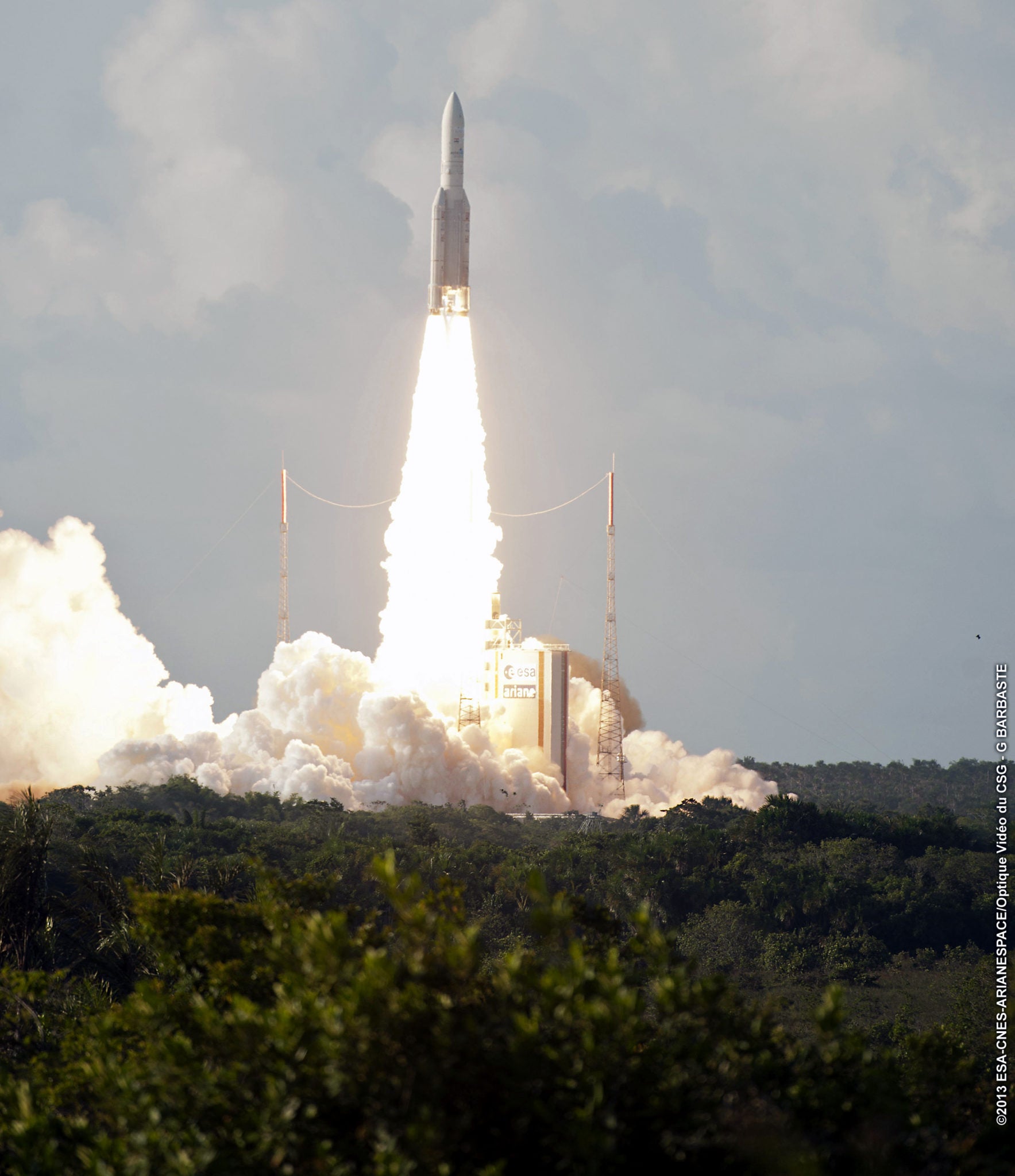 [Via Satellite 08-30-13] Arianespace completed its fourth Ariane 5 launch in 2013, making it the vehicle’s 57th successful launch in a row. The launcher carried two telecommunications satellites to orbit: the Eutelsat Communications and Es’hailSat jointly owned Eutelsat 25B/Es’hail 1, and the GSAT 7 for the Indian Space Research Organization (ISRO).